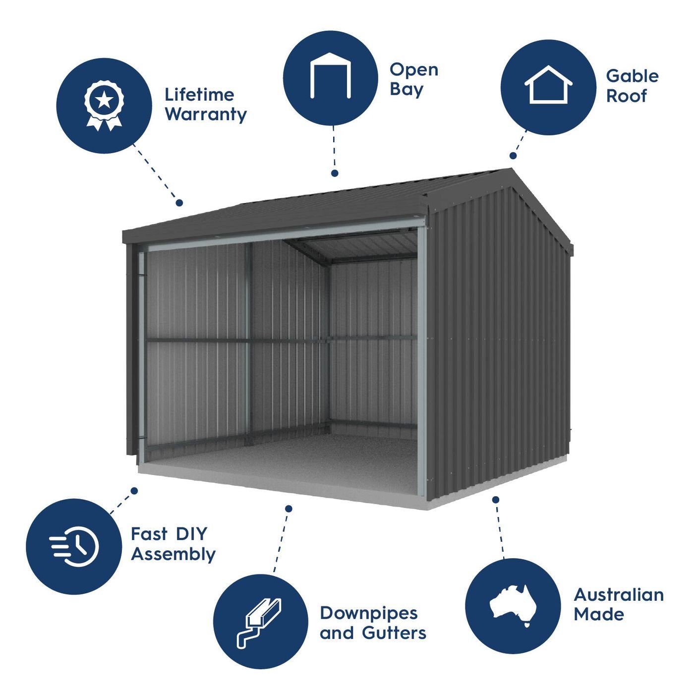 The Absco Rural Shed, is a single open bay storage solution tailored for convenience and durability. Boasting a generous door clearance of 2800 x 1930mm, this shed provides easy access, catering to the storage needs of tractors, hay, and larger equipment. Engineered for superior durability and fortified with a strong internal framework, it ensures lasting resilience in challenging farm or industrial environments. Complete with gutters and downpipes for effective water drainage, and an engineered N2 rating for added assurance, the Absco Rural Shed stands as a reliable and robust storage option, built to withstand the demands of your property. Made in Australia from high tensile steel, designed for tough Australian conditions, the Absco Rural also boasts a lifetime warranty. Engineers plans for submission to local authority may be required. Check with your local council before ordering. Absco sheds are designed to be anchored to a concrete slab (not supplied). Bolt down kits are included with this shed kit. Absco recommend working at waist height using trestles and timbers for a faster build. 2-3 people are required to build sheds larger than 1.5 x 1.5m to assist with holding panels upright during the final construction. More people are required for larger structures. To assist with your assembly, download the ‘Absco Sheds’ app to view easy to follow assembly videos and instruction manuals, warranty information, and product details. This app is free to download from the App Store and Google Play store.