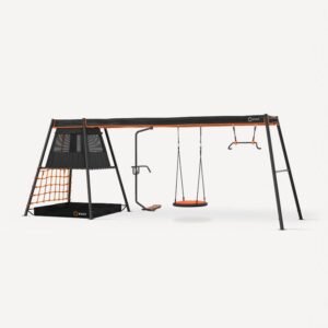 Transform your backyard into a playground paradise with the Walton Swing Set, Monkey Bars & Play centre, designed to fit perfectly in square backyards. This L-shaped play centre features a thrilling 2.2m wavy slide, a rock-climbing wall with ladder access and a versatile 3-position swing beam equipped with two swings and a trapeze. The unique 2-level upper fort with crow’s nest offers elevated fun and adventure, complemented by monkey bars for extra challenge and play. Thoroughly tested to Australian Standards, the Walton ensures a safe and high-quality play experience for Aussie kids. General Structure 120cm high raised playhouse Crow’s nest lookout area with telescope Step ladder & rock climbing feature 2 x seat swings and trapeze bar 2.2m Wavy Slide Hideaway area with pretend shop front and shade canopy Monkey Bars Anchors included Dimensions and Weight Assembled Dimensions: 482.5cm x 500.8cm x 330.9cm (L x W x H) Max Weight Capacity: A maximum of 50kg. per child is recommended for play activities designed for multiple child use. A maximum of 6 children is recommended for this play centre. Weight of Product: 187kg Safety Precautions Not suitable for children under 36 months – fall hazard Adult set-up required Adult supervision required at all times during use Only for domestic use Outdoor use only Natural Timber product, wood colour may vary Please allow a 2m safety perimeter Products may vary slightly from images shown On-site adult supervision is required. Place the equipment not less than 2.0 m from any structure or obstruction such as a fence, garage, house, overhanging branches, laundry lines, or electrical wires. Do not install home playground equipment over hard surface to avoid serious injury to the equipment user. Warranty 12 months manufacturer’s defect on parts 3 years warranty on wood rot and insect damage Assembly Required: This product arrives flat-packed with assembly instructions included.