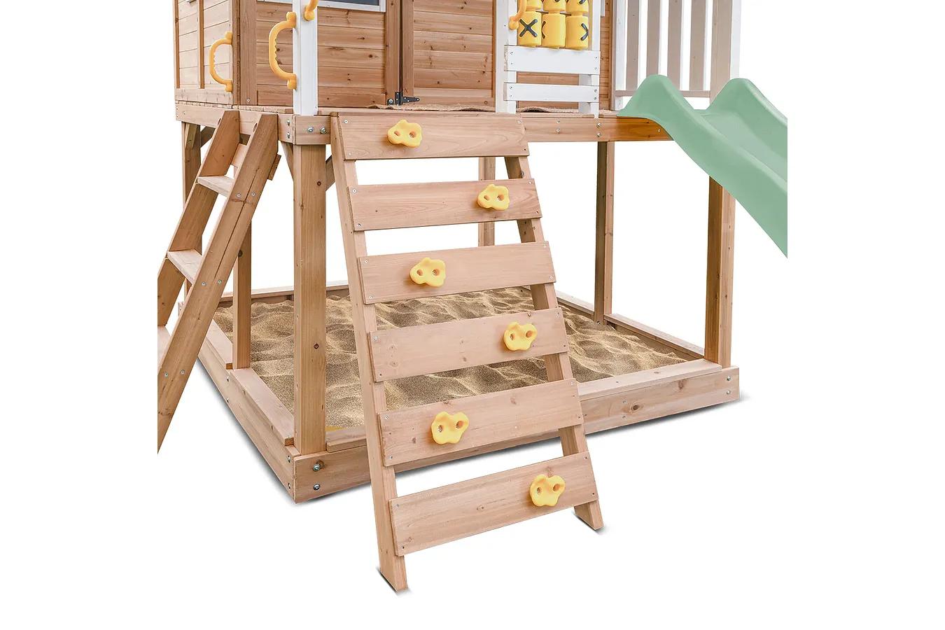 • Spacious Sandpit – Located underneath the raised cubby, perfect for imaginative play and digging.